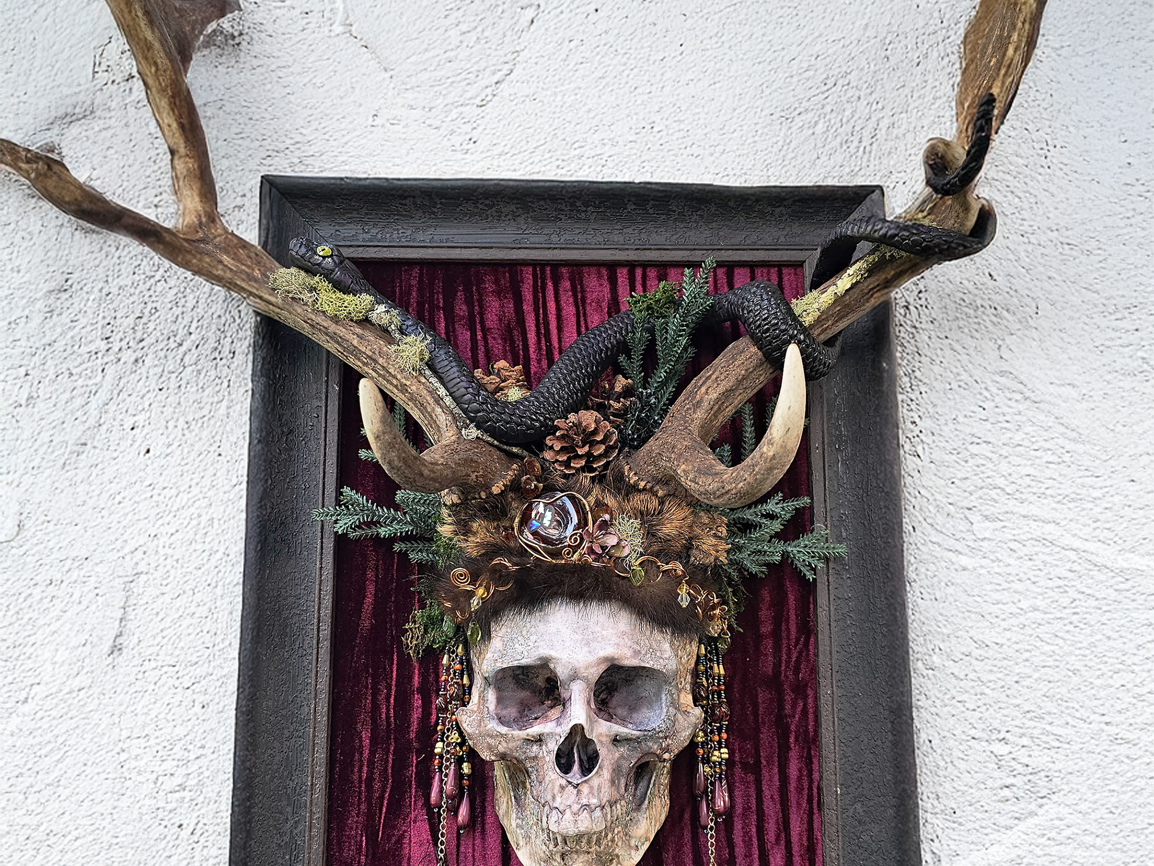In this series I focus on lost cultures and forgotten rituals. By blending natures materials such as deer antlers and fur, with modern materials of resin, wire and adornments, I aim to capture a haunting yet beautiful image of ancient civilizations of a bygone era.